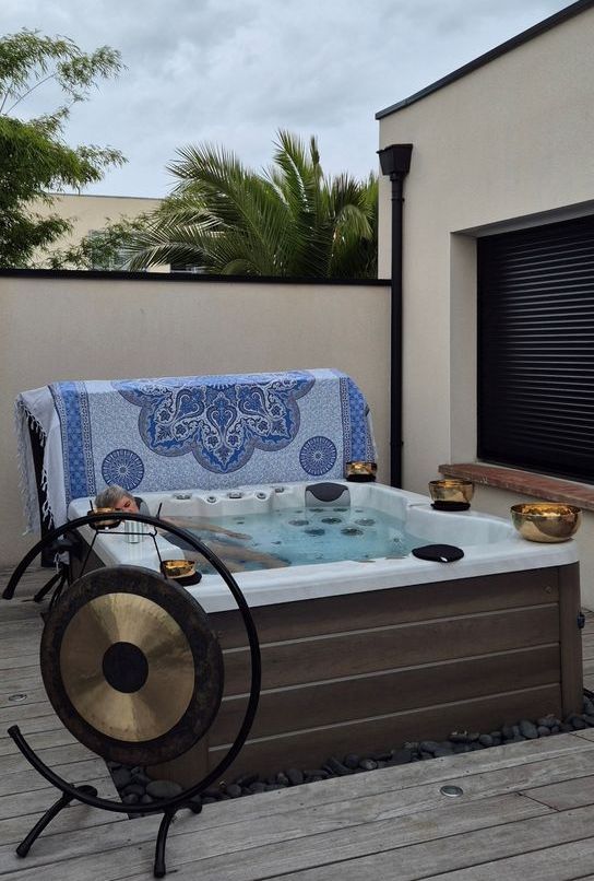 Immergé dans une eau à 34°C, seul ou en couple, vous profitez d’abord des jets massants pendant 15 minutes, avant que le soin sonore commence.